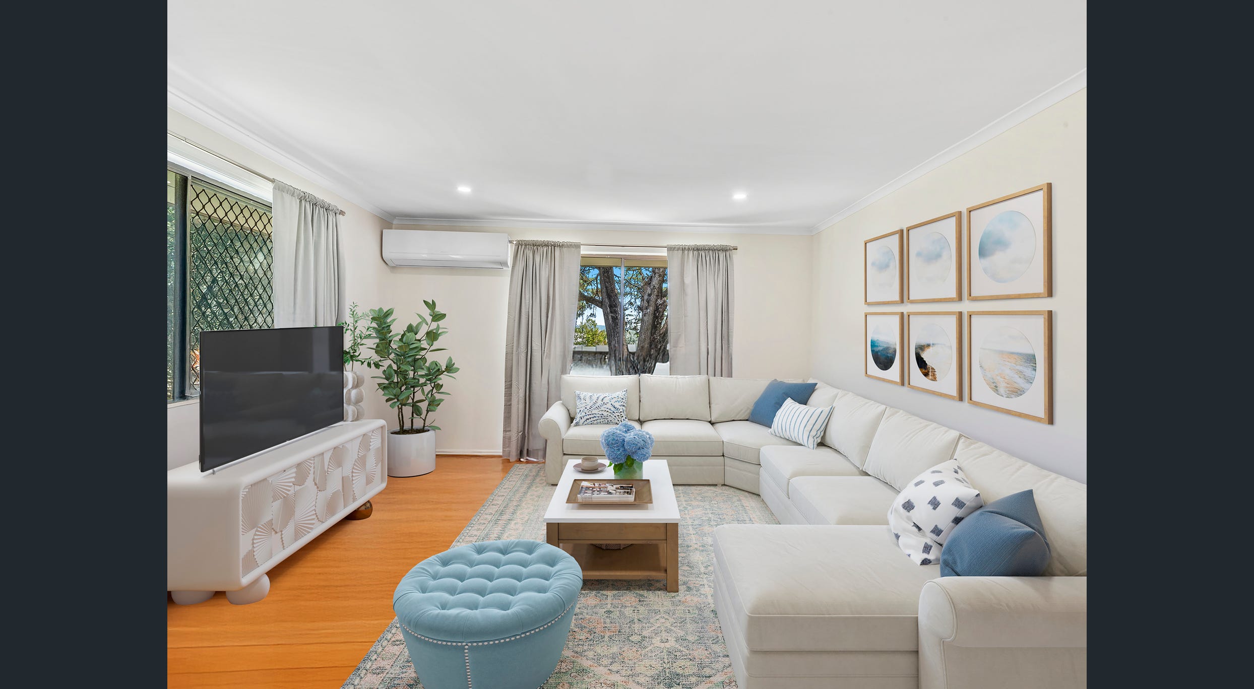 - Open-plan living, kitchen, and dining area with reverse cycle air conditioning